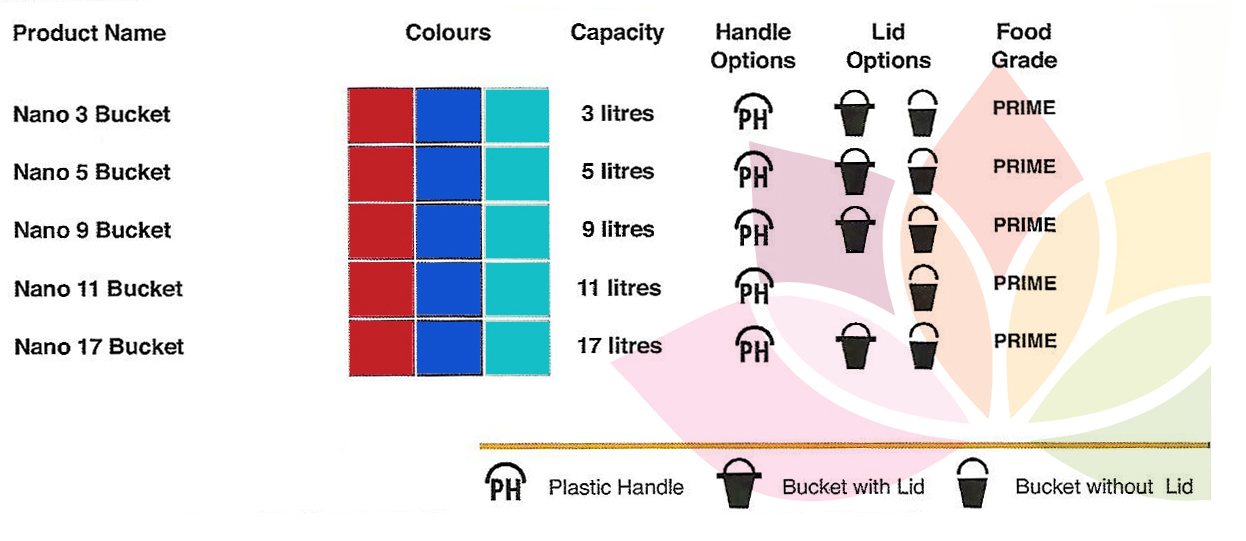 Available in sizes : 3L, 5L, 9L, 11L and 17L with and without lids.